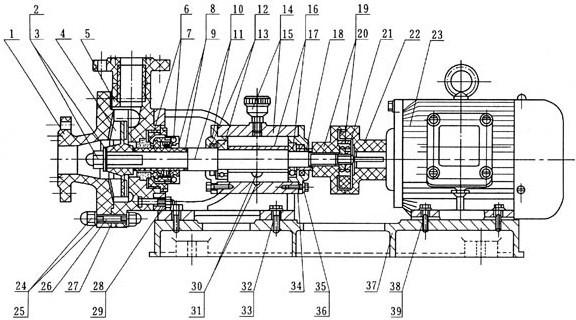6、如果更換滾珠軸承或泵軸時,必須折下機架,松開前端軸承蓋4只螺釘,折下泵軸后端園螺母和聯軸節,將泵軸向前端方向打出即可,再后折下后端軸封蓋。